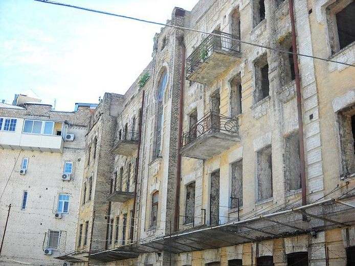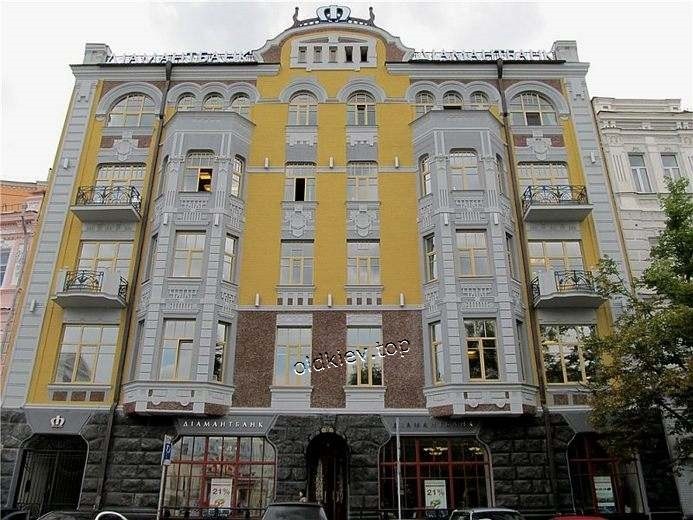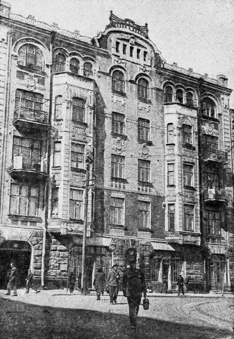 1940г. Контрактовая площадь, 10 Главный дом усадьбы (в глубине двора расположены два флигеля). Построен на месте 2этажного каменного дома, который был построен в конце 18 в. арх. И. Григоровичем-Барским для Григория (Юрия) Дранчева. В 1781г. этот участок был приобретен для первой в Киеве конторы Ассигнационного банка, который находился здесь до 1788г., когда был ликвидирован. В 1789г. усадьбу передано Малороссийскому почтамту для устройства губернской почтовой конторы, которая действовала здесь до пожара 1811. В нач. 20в. дом принадлежал купцу 1-й гильдии А. Липкесу - на замковом камне арки главного входа сохранилась монограмма владельца. Пятиэтажный, на подвале, кирпичный, в плане Т-образный, с боковым проездом во двор, в стиле модерн. Первый этаж использовался под магазин. Главный фасад симметричный, при его обработке применены рваный и полированный лабрадорит, гладкий и фактурный штукатурка, покраска поверхности стен и характерное для модерна лепки. В оформлении интерьеров квартир были использованы два варианта классицистического отделки, которые чередовались по этажам. |