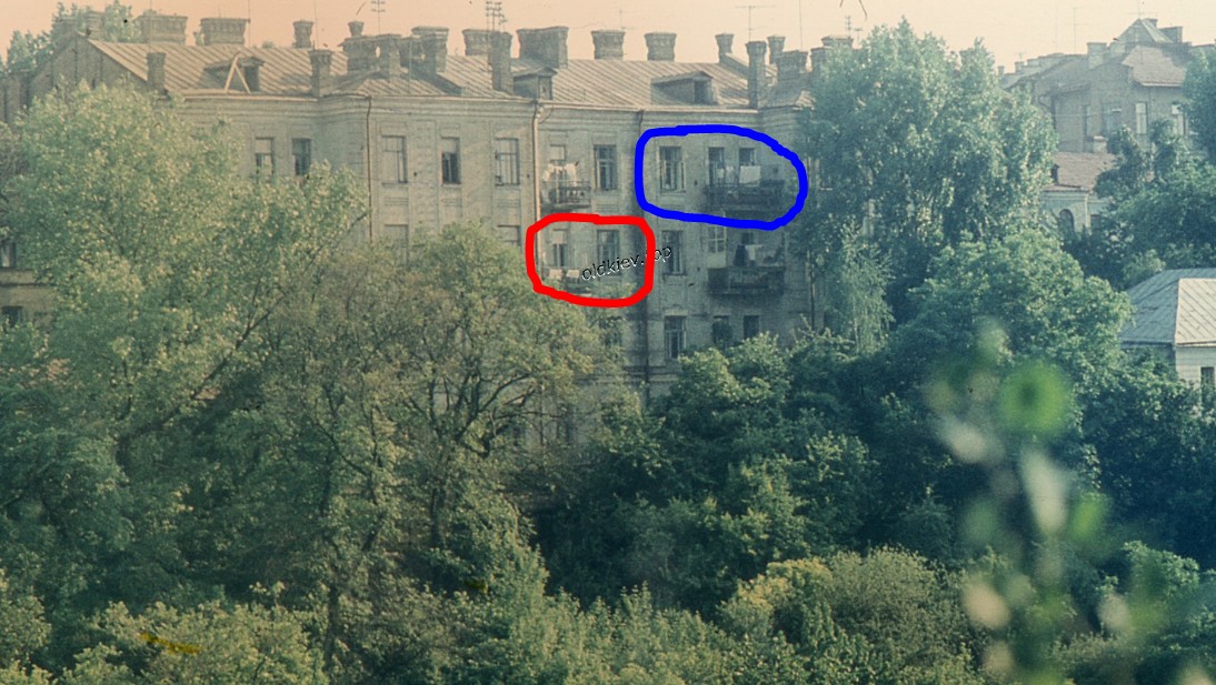 1982 год. Большая Житомирская улица, 20 со стороны Исторического музея. Помечены красным (на 3-м этаже) окна семьи Михаила Домбругова (чтобы было ясно, с какого балкона было сделано второе фото), и синим - окна и балкон семьи Александра Лунёва. |