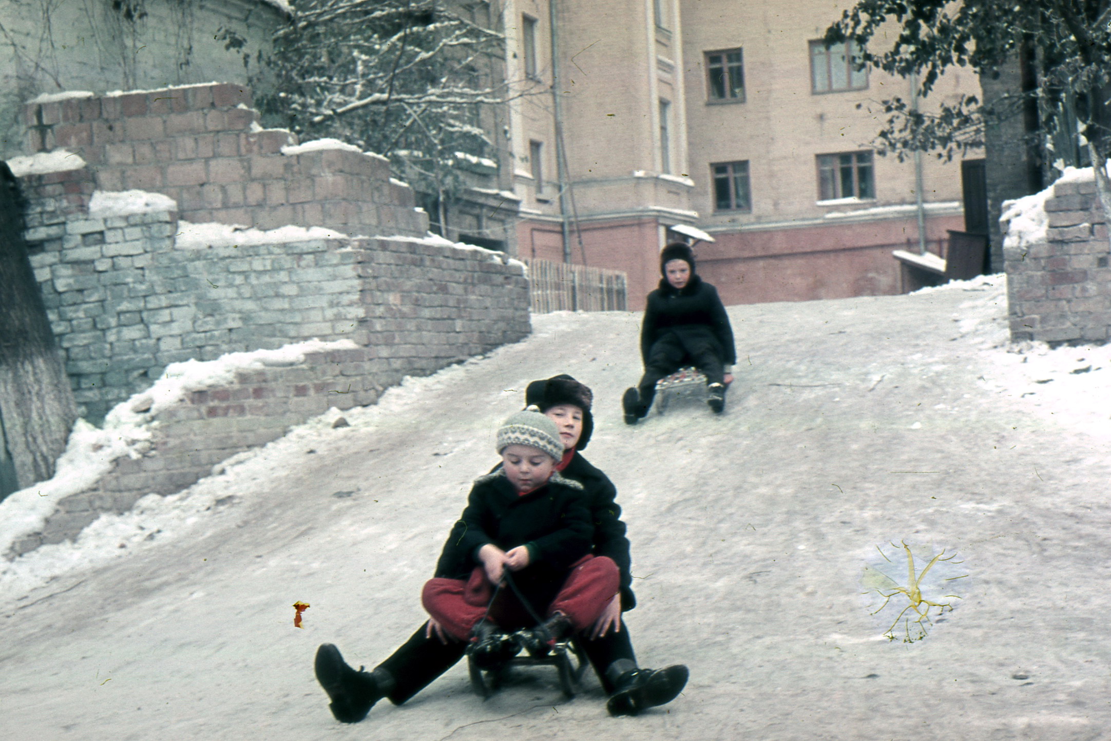 янв. 1965г. Съезд со двора Большой Житомирской, №16-18 во двор Б.Ж. №20, который зимой всегда превращался в санную горку. На первых санках Михаил Домбругов и Александр Лунев автор фото - Рэм Матвеевич Домбругов, слайдовая пленку ORWO-color фотоаппарат Киев-4 |