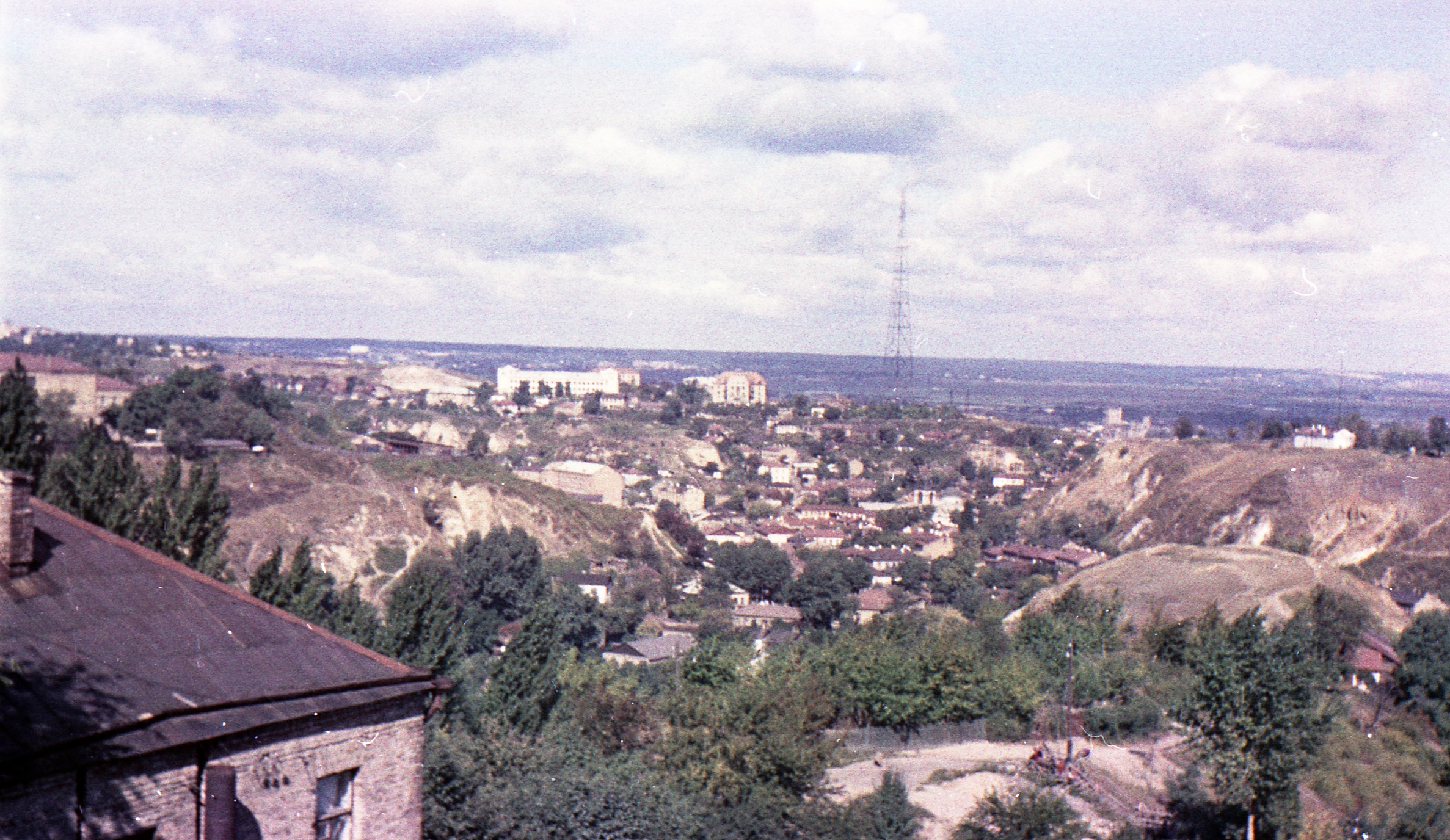 1986 год, лето.После Чернобыля.Продолжается строительство Пейзажки. Задний двор (в сторону Подола) Б. Житомирская, 20 (справа). Слева на снимке здание в белой плитке - Киевэлектромонтаж.Сейчас на этом месте крутой ресторан Монако (сейчас он, возможно, называется иначе и на данный момент кажется не работает) .Справо от дороги круглое здание-трансформаторная будка, недавно ее снесли.Она - с задней части дома Б. Житомирская, 16 |