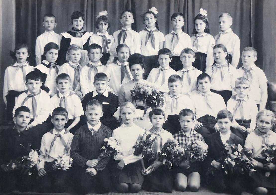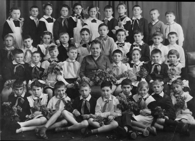 1968 год. 19 февраля. 3- А класс. Первой учительнице - Фавсте Ивановне Васильевой - 50 лет. слева-направо: 1й ряд. Сокол Сергей. Полякова Света. Савинов Виктор. Солодкий Павел. Литичевский Дмитрий. Мильграм Александр, Дедекало Ирина, Анатолий Котляревский, Клокова Тамара. 2й ряд. Кацимон Игорь. Маковский Евгений. Плужник Лилия, Примак Александр, Фавста Ивановна Васильева, Котляр Александр, Липская Елена, Баскаков Игорь, Березовская Ирина, 3й ряд. Вороневич Валентин, Резницкий Борис, Антоша Оксана, Харевич Дмитрий, Гофман Жанна, Сахно Владимир, Ушомирская Людмила, Григоренко Вячеслав, Горовой Александр, Гун Марк. 4й ряд. Таборовская Ирина, Калашников Александр, Мельникова Наталия, Зеликовский Игорь, Нечаева Татьяна, Матвеева Наталия, Чучуев Александр, Сарнецкая Ирина, Щуревский Владимир, Юдин Александр, Лившиц Игорь. |